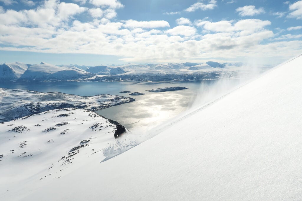 Från toppen av Bjørnskartindan bär det av ner mot Langsundet i resans sista åk. Svängar som sitter kvar långt efter att skidorna packats ner.