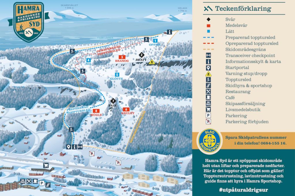 Även om andra skidorter som Kläppen och Funäsdals-berget har dragit randonnée-leder upp i redan befintliga skidområden så är Hamra Syd först med att ha ett topptursområde på ett eget berg.