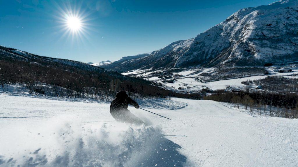 Högt ovanför Gudbrandsdalen ligger hytterna på rekke og rad, med utsikt mot Dovre i fjärran. Sindre skiter i det och kör neråt.