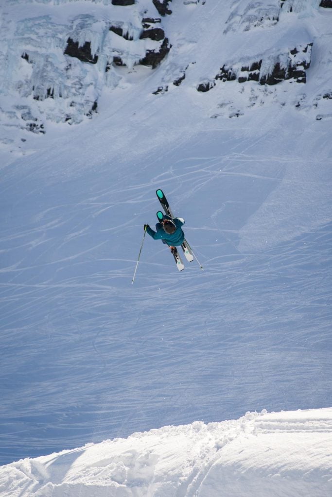 I sina toppturspjäxor försöker han sig på dubblar gång efter annan med blandat resultat i landningen.