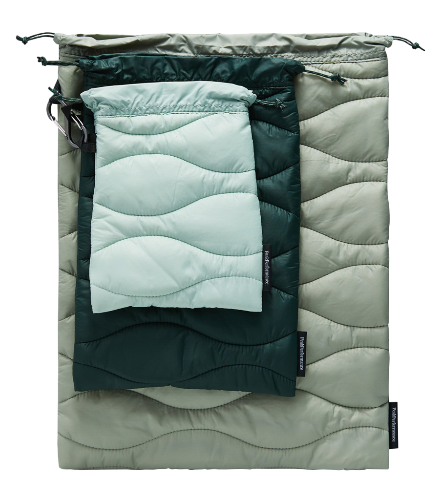Tre praktiska och vadderade packpåsar i olika storlekar och färger.