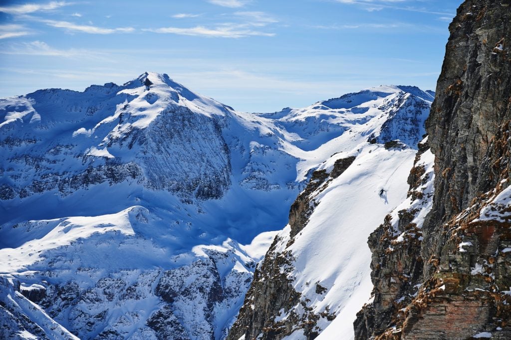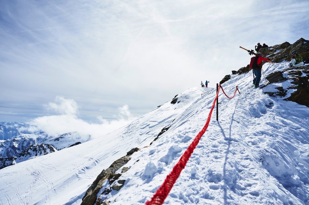 Från toppen på dryga 3000 meter är det bara några få några få pjäxsteg från pisten för att nå det branta insteget.