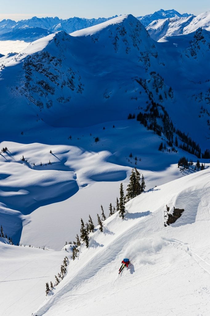 Offpiståkning men innanför skidområdets avgränsning, så kallad inbounds-åkning, blir inte så mycket bättre än så här. Stora ytor och kul terräng. Hajka upp en liten bit för att starta åket i Greely Bowl – helt klart värt den lilla promenaden.