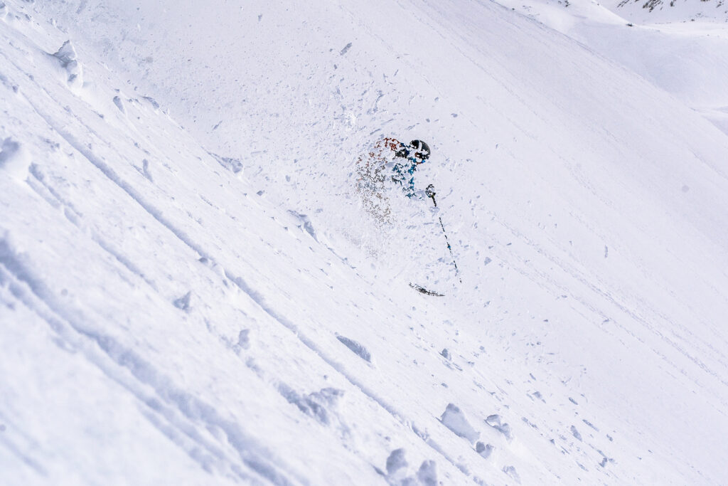 Vi får till några bra svängar i begynnande sorbetsnö genom de öppna rännorna och över de konvexa åsarna som snirklar sig ner mot dalen igen. T