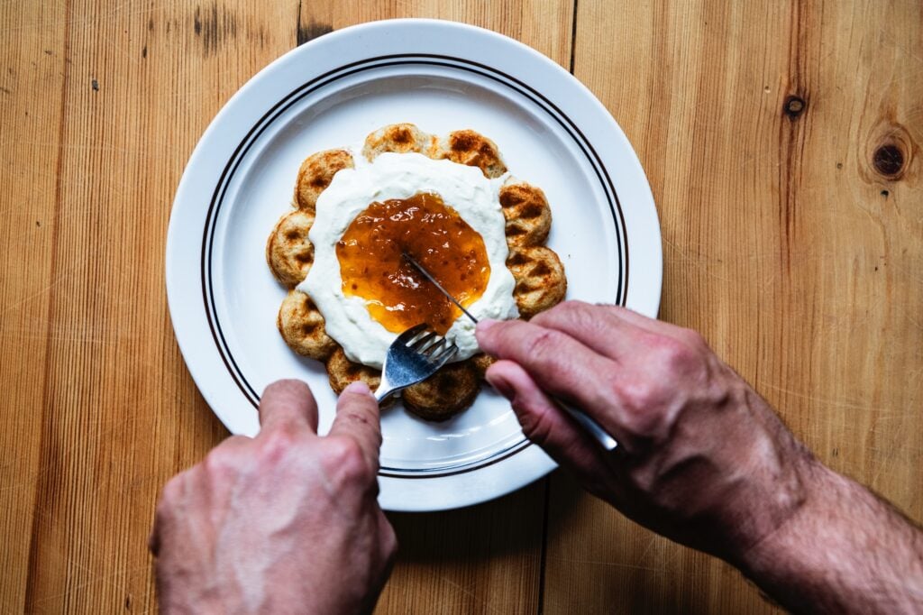 Stenlund och jag njuter av varsin våffla och kaffe medan vi konstaterar att det varit en bra kväll för vår premiär i Luossavaarabacken.