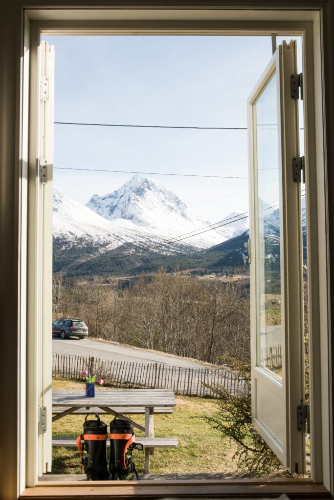 Blicken vandrar bort mot Isfjorden och precis ovanför där vi huserar på nätterna, Romsdal Lodge, tar berget formen av en gigantisk backhoppningsbacke, som en enorm ramp.