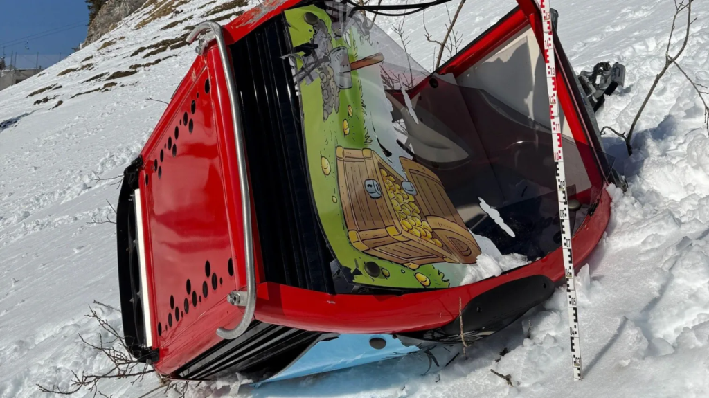 En kabin från Titlis Xpress Trübsee lossande under onsdagsförmiddagen och kraschade voltandes nedför en sluttning på berget.